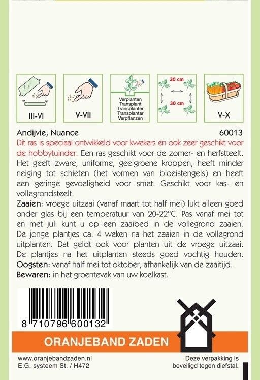 Andijvie zaden Nuance. Dit ras is speciaal ontwikkeld voor kwekers en ook zeer geschikt voor de hobbytuinder. 'Nuance' is een uitstekende selectie voor de zomer- en herfstteelt en geeft zware, uniforme, geelgroene kroppen. Weinig gevoelig voor schieten (het vormen van een bloeistengel) en een geringe gevoeligheid voor smet. Geschikt voor kas- en vollegrondsteelt.