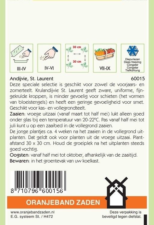 Deze speciale selectie is geschikt voor de voorjaars- en zomerteelt. Krulandijvie St. Laurent geeft zware, uniforme, fijngekrulde kroppen, is minder gevoelig voor schieten (het vormen van bloeistengel) en heeft een geringe gevoeligheid voor smet. Geschikt voor kas- en vollegrondteelt.