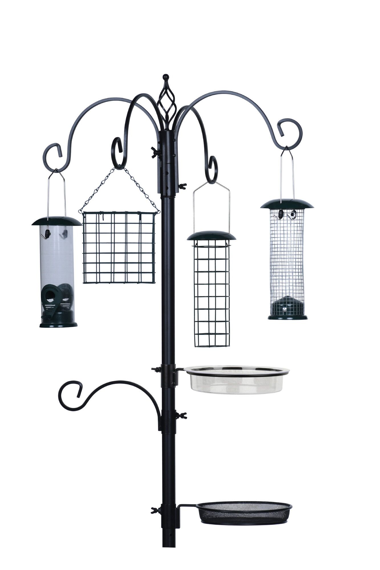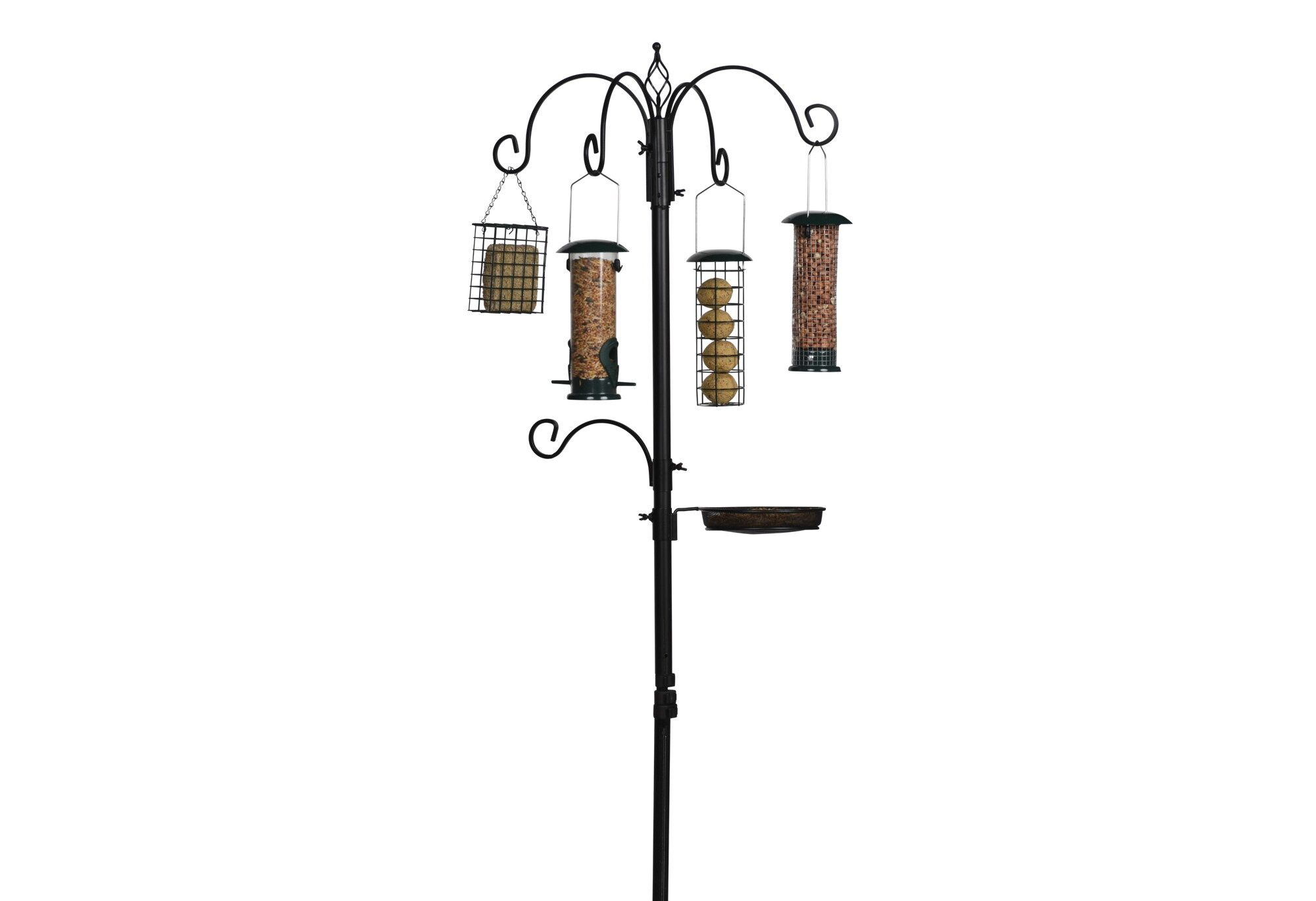 Het bestaat uit een 210cm (185 cm bovengronds) hoge metalen staander die je in de grond kunt plaatsen. Het station is voorzien van 4 decoratieve haken (waaraan je de meegeleverde feeders kunt hangen) een extra feederhaak, een vogelbadje een voedertray. Het station is eenvoudig in elkaar te zetten en is ideaal voor in elke tuin.