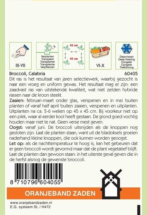 Broccoli zaden Calabria. Het ras "Calabria' broccoli is het resultaat van jaren selectiewerk uit het bekende ras groene Calabrese, waarbij gezocht is naar een vroeg, productief en uniform gewas. Het resultaat mag er zijn, een zaadvast broccoli ras van uitstekende kwaliteit, wat niet zelden hybride rassen naar de kroon steekt.