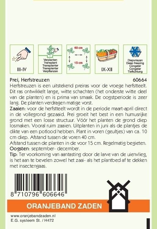 Prei zaden Herfstreuzen. 'Herfstreuzen' is een uitstekend preiras voor de vroege herfstteelt. Dit preiras ontwikkelt lange, witte schachten (het onderste witte deel van de planten) en is prima van smaak. Oogstperiode is zeer lang. De planten verdragen matige vorst.