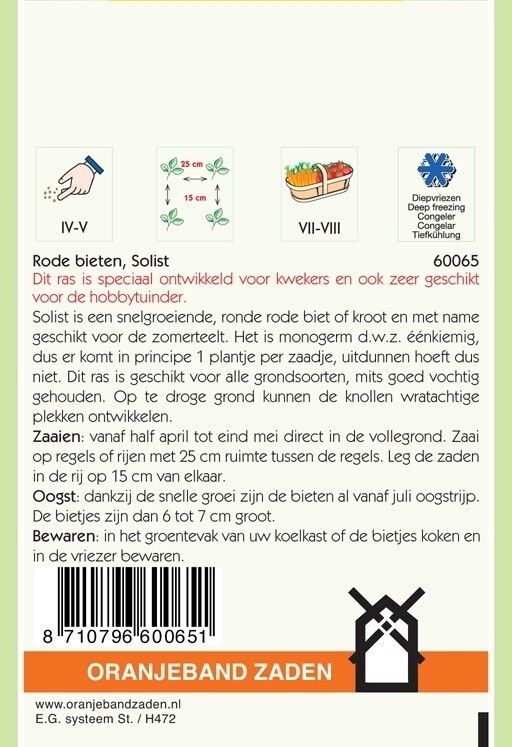 Rode Bieten Solist (Monogerm). Dit zaad is het resultaat van jarenlang selectiewerk. Solist is een snelgroeiende, ronde rode biet of kroot en met name geschikt voor de zomerteelt. Het is monogerm d.w.z. éénkiemig, dus er komt in principe 1 plantje per zaadje, uitdunnen hoeft dus niet. Dit ras is geschikt voor alle grondsoorten, mits goed vochtig gehouden. Op te droge grond kunnen de knollen wratachtige plekken ontwikkelen (schurft).