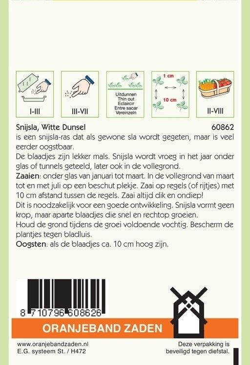 Zaden Snij sla Witte Dunsel. Snij sla Witte Dunsel is een snij sla-ras dat als gewone sla wordt gegeten, maar deze slasoort is veel eerder oogstbaar. De blaadjes zijn lekker mals. Snijsla wordt vroeg in het jaar onder glas of tunnels geteeld, later ook in de vollegrond.