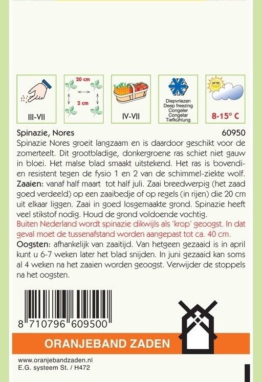Spinazie Nores (15 gram) groeit langzaam en is daardoor geschikt voor de zomerteelt. Dit grootbladige, donkergroene ras schiet niet gauw in bloei. Het malse blad smaakt uitstekend. Het ras is bovendien resistent tegen de fysio 1 en 2 van de schimmel-ziekte wolf.