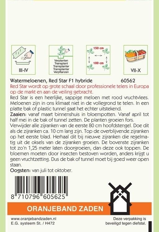 Watermeloenen Red Star F1 Hybride zaden. 'Red Star' is een exclusief kweekproduct van Nunza BV te Haelen en wordt op grote schaal door professionele telers in Europa op de markt en aan de veiling gebracht, een garantie voor extra kwaliteit. Red Star F1 hybride is en heerlijke, sappige meloen met rood vruchtvlees. Meloenen zijn in ons klimaat niet in de volle grond te telen. In een platte bak of plastic tunnel gaat het echter uitstekend.